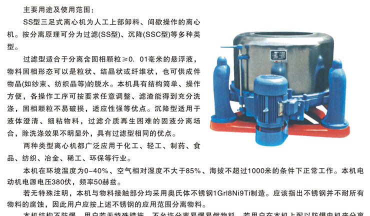 SS型三足式離心機為人工上部卸料、間歇操作的離心機。按分離原理可分為過濾(SS型)、沉降(SSC型)等多種類型。